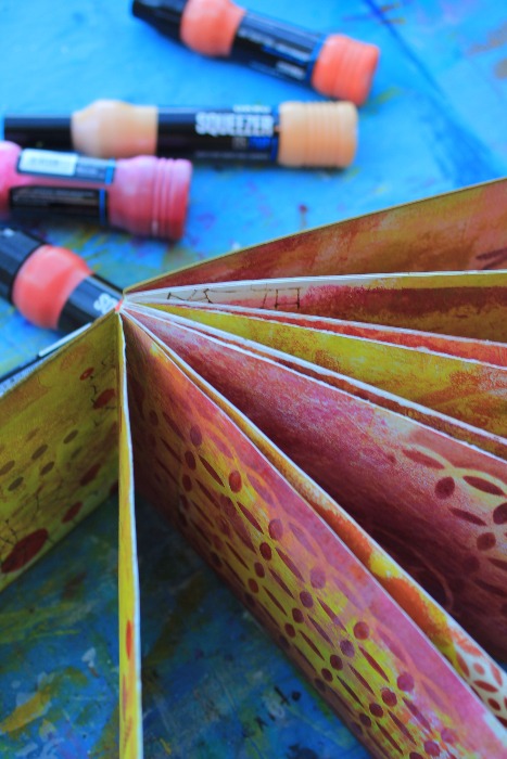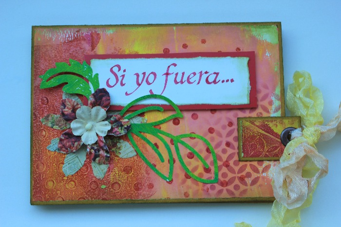 Luego de cortar las hojas hice los fondos, con acrílicos y la placa gelli, para que el color sea uno de los común-denominadores de mi libro, predominan los tonos cálidos, amarillos, naranja, rojos, muy del otoño. Terminé pegándole las tapas en cartón y decorándolo.