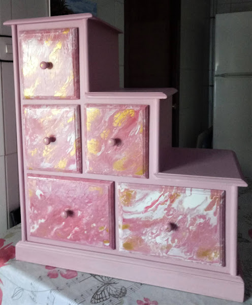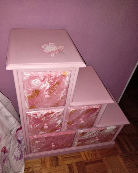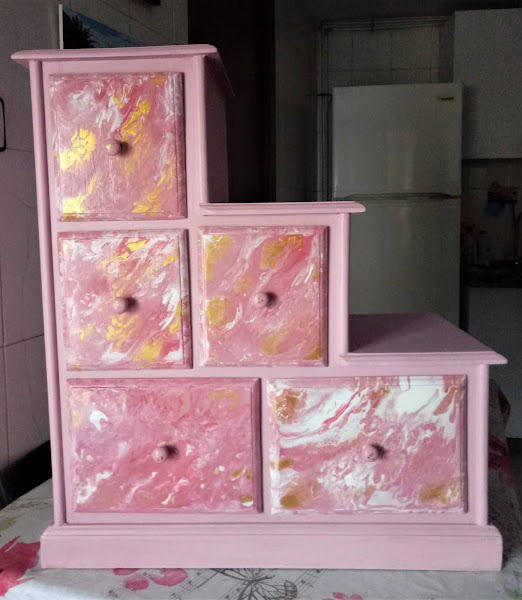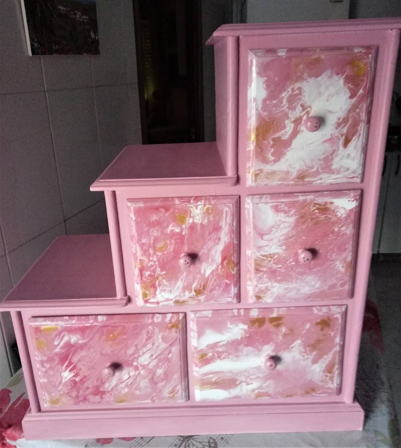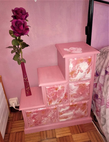 Estas mesillas las tengo desde hace muchos años. Las compre en la feria, en Portugal. Son de madera de Pino. Y, como veis, ya han pasado varias etapas. Primero las tuve solo con barniz. Luego, metida ya en esto de las manualidades, las restauré una primera vez. Y como me mudé y me encontre que me habían empezado a coger polílla, aprovechando que les daba el tratamiento para eliminarla, decidí ponerlas al día, utlizando para ello la técnica del Pouring o Acrílico Fluido. Habrá a quien les gusten más como estaban antes, pero como son mis manitas las que las pueden transformar en cualquier momento, por un tiempito se van a quedar así. Y yo disfrutando de mi trabajo.
