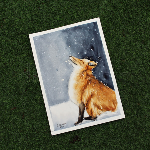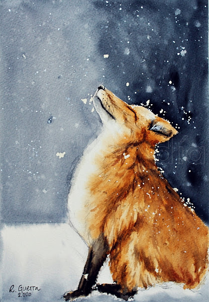 Comienzo enseñando la acuarela de la semana pasada, que fue un simpático zorrito en la nieve. No me diréis que no tiene cara de estar disfrutando lo más grande, ¿verdad?: