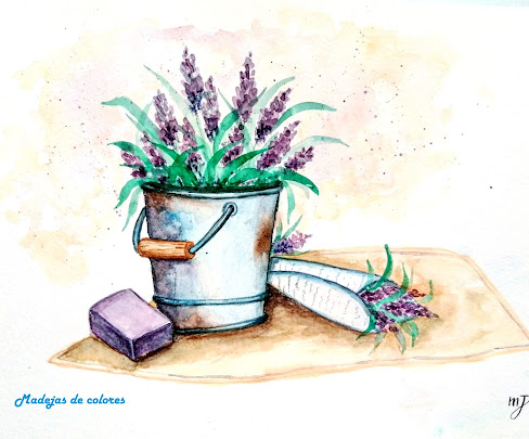 Continúo con unas lavandas en cubo metálico oxidado, al lado pastilla de jabón y cucurucho.