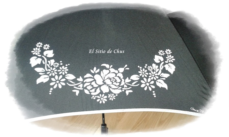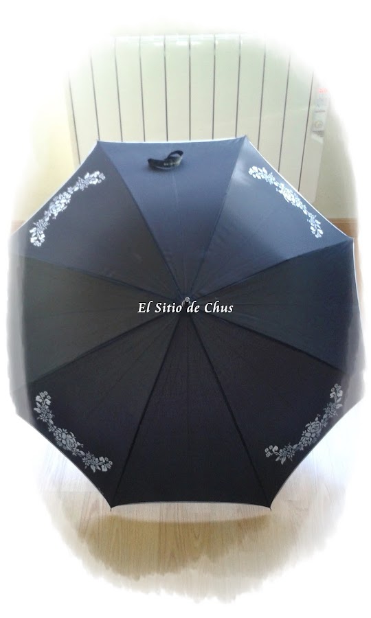 Primero calqué con calco amarillo el dibujo en 4 de las caras del paraguas (se me olvidó hacer la foto del paraguas en ese estado), y una vez ya preparado cogí el bote de la paciencia y el de la pintura blanca y a pintar se dijo!