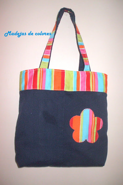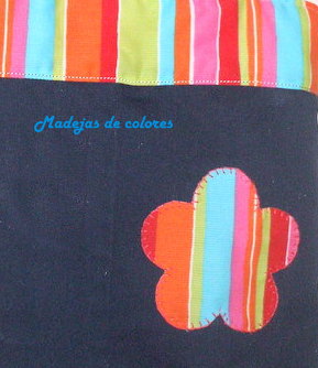 Combinando tela azul marina con otra bien alegre de listas con varios colores, añadí una franja en la parte superior. En las asas, combiné la azul por detrás, dejando que asomara un filo por los lados de la estampada.