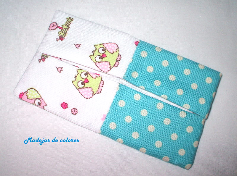 También le hice un guarda-pañuelos aprovechando un trocito de tela que tenía guardada pues me encanta su estampado de búhos, para que me alcanzara lo combiné con otra turquesa de lunares blancos. Me encanta como quedó la combinación, lástima que no salgan los verdaderos tonos.