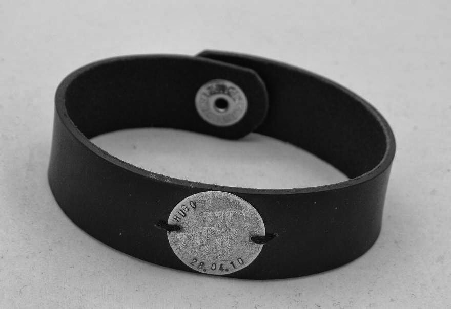 Brazalete en negro o marrón oscuro con chapita de plata personalizada.