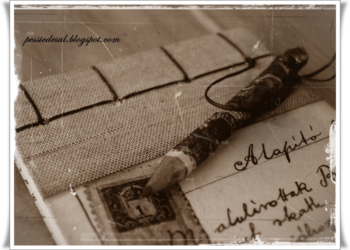 Un papel de mi última adquisición en la tienda de Ada, precioso lleno de letras antiguas, sellos, plumas... El tamaño, la forma, el cosido,todo es diferente. Pensé que ,ya que soy tan aficionada a hacerme listas para todo, esta me vendría genial por su forma alargada y que invita a escribir listas infinitas...