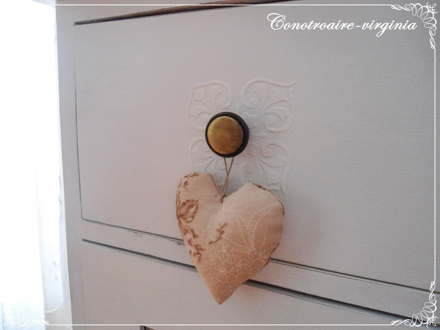 He confeccionado con la misma telita el colgador en forma de corazón y una cortinilla para la puerta con cristal.