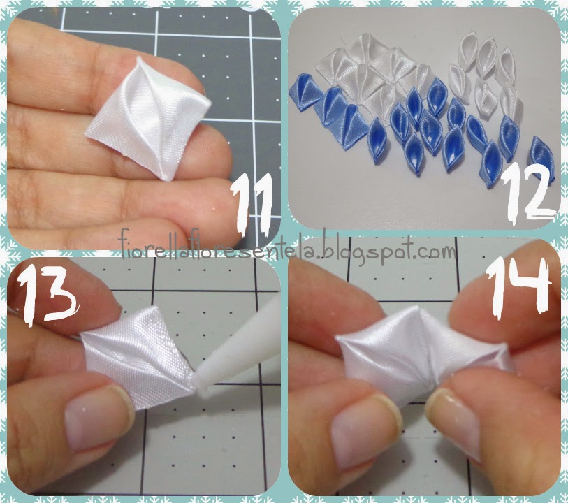 12. Utilizaremos 6 pétalos como este en color blanco y 3 en color celeste. Además 6 pétalos blancos como los que aprendimos a hacer para el ramillete de la rosa en tonos de otoño, y 12 celestes de éste mismo tipo.