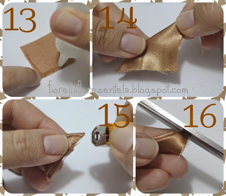 13. Para el segundo tipo de pétalo que conformará el ramillete, comenzamos aplicando al cuadrado de tela silicona líquida en dos de sus lados.