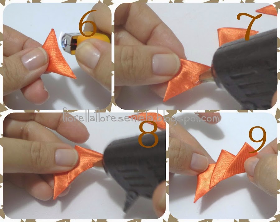 7. 8. y 9. Para unir los pétalos utilizaremos la pistola de silicona caliente, en uno de los pétalos formados aplicamos solo en la mitad la silicona para sobreponer otro pétalo, lo hacemos así con los 3 pétalos del primer color.