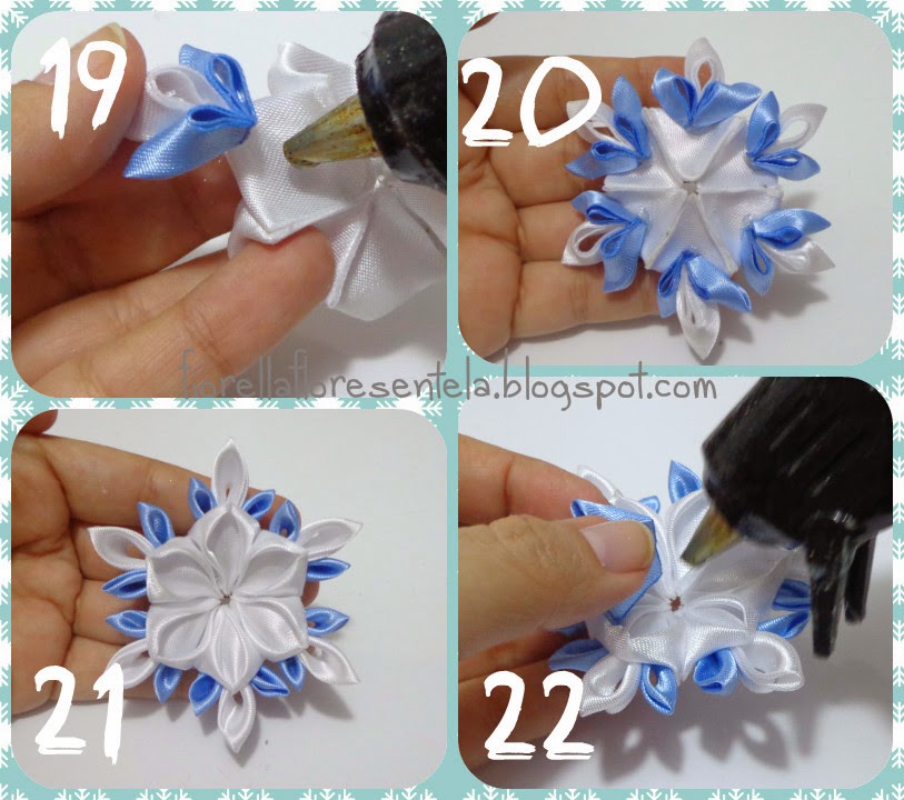 18. Por el revés del centro blanco vamos pegando los ramillates de 3 (2 celestes 1 blanco), con la pistola de silicona.