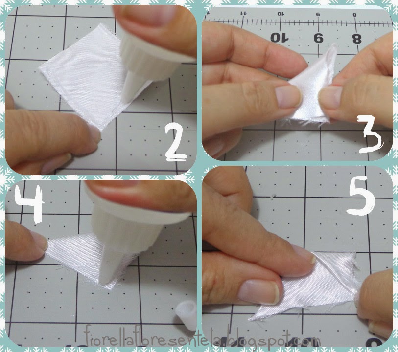 2. Para los pétalos de la rosa aplicamos silicona líquida en dos de los lados del cuadrado de tela.