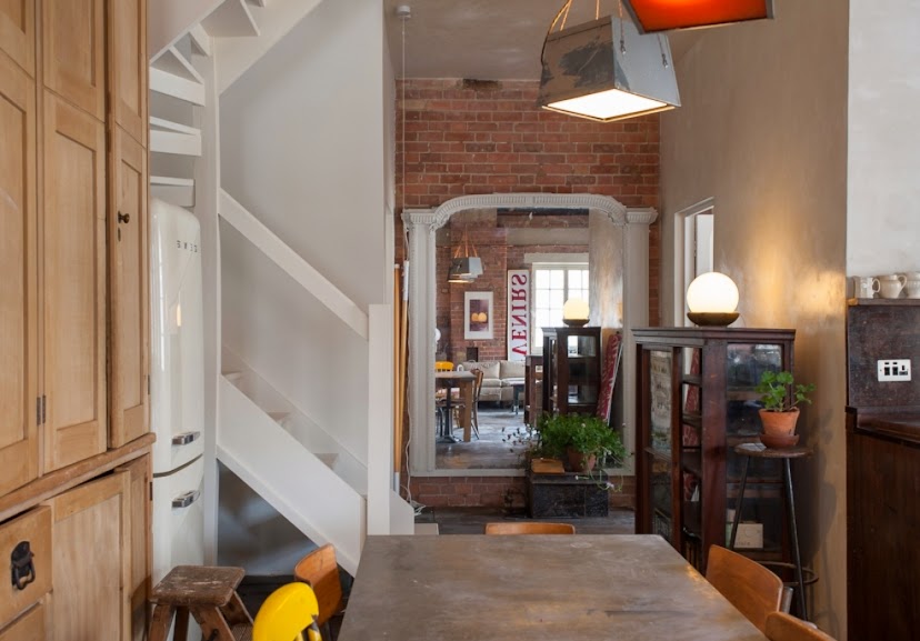 ladrillo visto, techos de madera, cocina integrada en el salón, gran número de