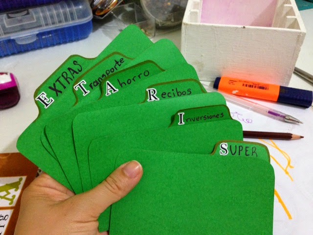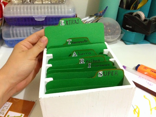 Luego vamos a poner títulos en las pestañas, lo que escogí fue "Súper", "Inversiones", "Recibos", "Ahorro", "Transporte" y "Extras", para eso usamos las calcomanías, podemos poner los títulos que necesitamos personalmente, en mi caso esos he puesto, pero creo que haré un par de carpetas más, a la cajita le cabe mas, la idea es dividir bien los gastos.