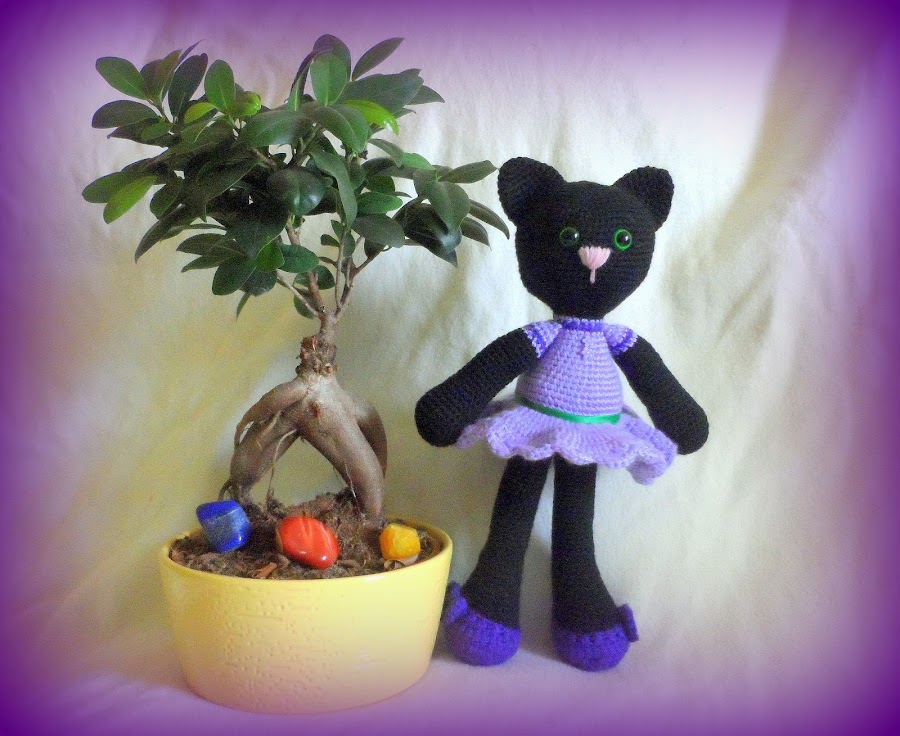 El otro día, bicheando por aqui, ví estás preciosas gatitas color crema en una página y pregunté si me la podría hacer en otro color y con el vestido violeta y los ojos verdes... Dicho y hecho, Clau, ésta zaragozana, se adapta a nuestros gustos y me hizo ésta preciosa amigurumi negrita, que la verdad, al llegar a casa comprobé que en mis manos, es aún más bonica, y grandota, casi más que mi ficus. Y aquí está, en el salón, de reina de la casa (como mi pareja no me deja tener gatos... pues de ganchillo mismo). Además, en su página hay ratones, muñecas, ositos, y todo lo que cabe en la imaginación de ésta artistaza de las agujas.
