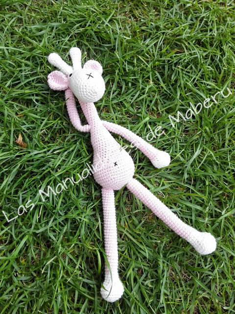 Como veis, no he añadido los círculos blancos a modo de manchas en el pelaje. Probé a hacerlos pero no me terminaban de convencer como quedaban, así que los descarté, aunque eso va según gustos, claro. También he modificado la longitud del cuello, las patas y los brazos haciéndolos un pelín más largos. Y los ojos, en lugar de ir bordados, les he colocado ojos de seguridad de 6mm. La última modificación que he hecho sobre el patrón ha sido marcar la nariz y el ombligo con unas sencillas puntadas en forma de X.