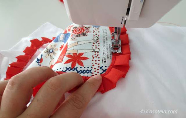 Ve despacio y colocando bien el adorno alrededor de la aplicación. Cosemos sobre la costura que ya trae el plisado con hilo del mismo color.