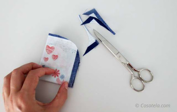 Mi aplicación es cuadrada pero voy a redondear los bordes porque así me va a resultar más fácil colocar los adornos. Doblo hasta unir todos los picos y los corto a la vez para que me queden iguales.