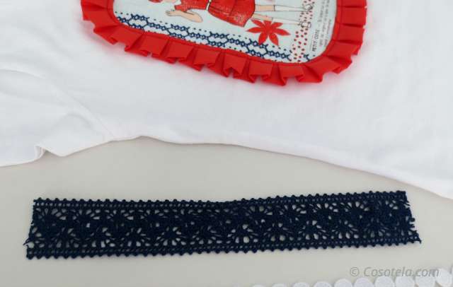 Aunque no queda mal el plisado así tal cual, yo he decidido ponerlo otro adorno justo en la costura para que no se vea. He elegido este guipur de circulitos en blanco de 1,5 cm de ancho.