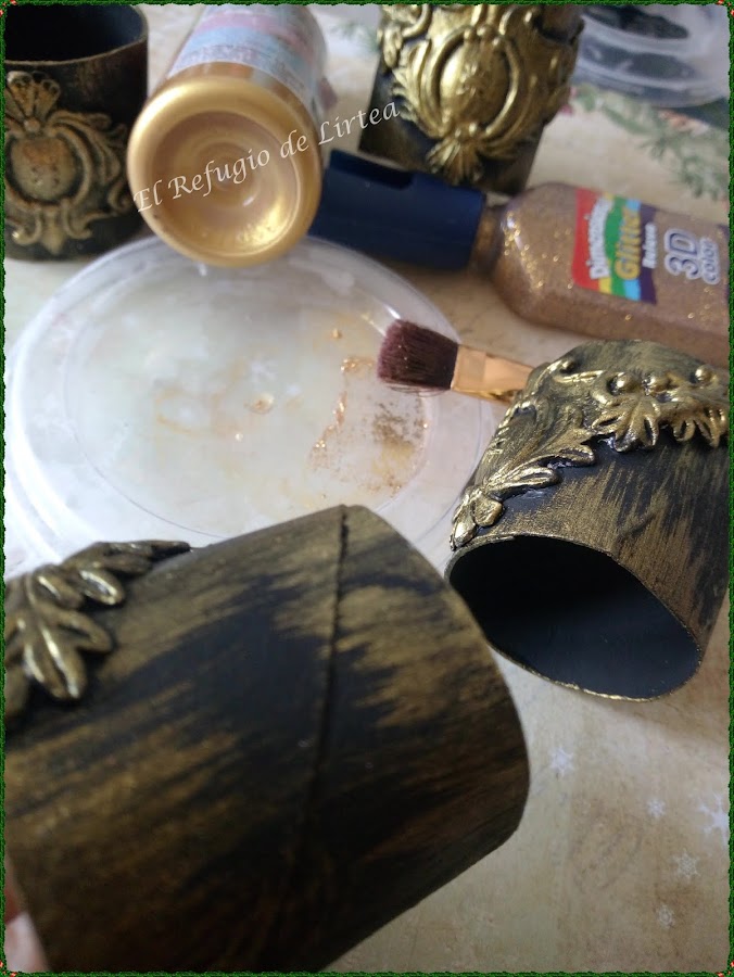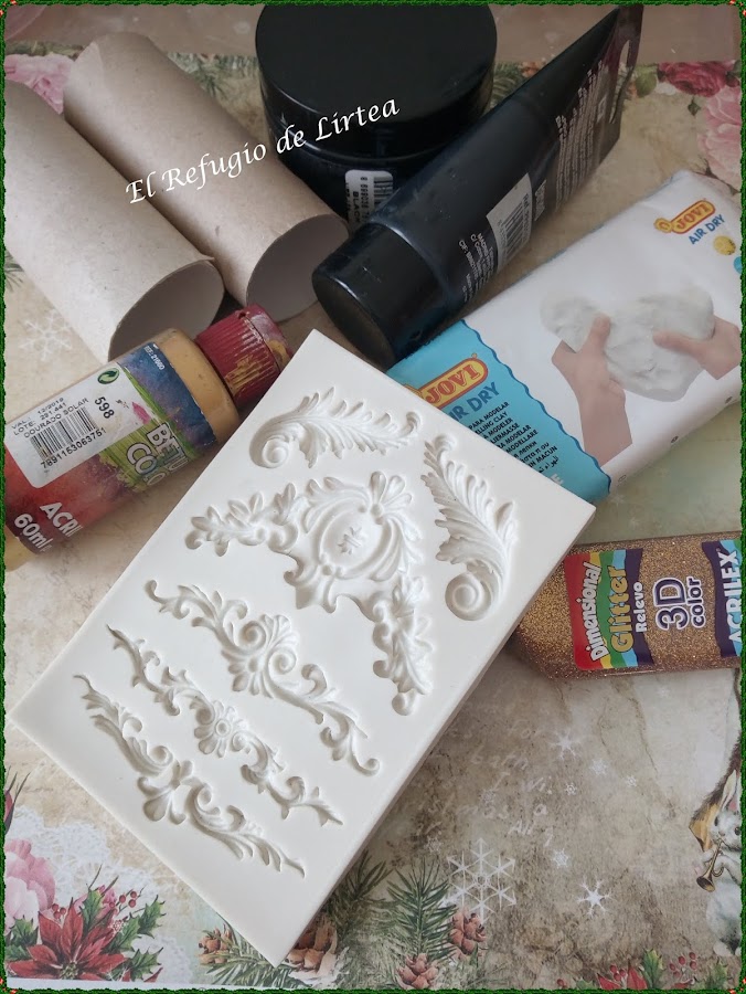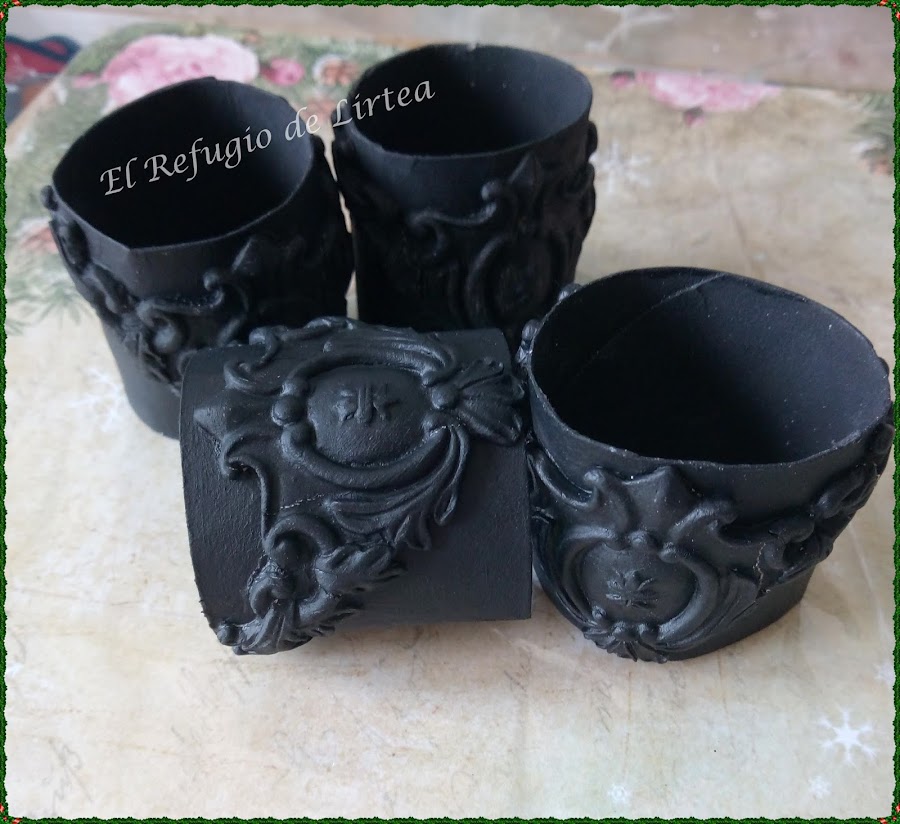 Tubos de cartón del papel higiénico, pasta de modelar de secado al aire, gesso negro o pintura acrílica negra, unos moldes de silicona flexibles y pátina color oro o pintura acrílica en color oro.