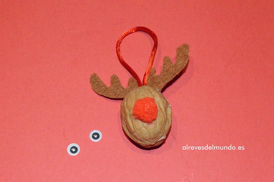- Pegamos en el interior un trozo de lazo o cola de ratón y también los cuernos. Después la cerramos