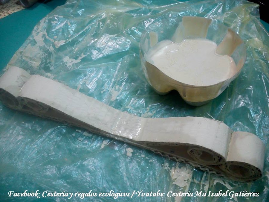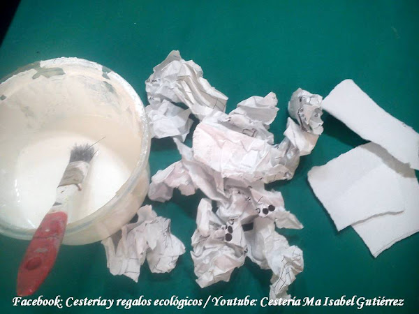 Aparte, cortaremos (con nuestras manos, NO con tijeras) pedazos pequeños de papel, puede ser cualquier tipo de papel (de revistas, de diarios o de folletos), y los arrugamos bastante... con esto aplicaremos dos capas de cartapesta. La cartapesta consiste en pegar pedazos pequeños de papel con una mezcla muy aguada de pegamento o cola blanca, diluida en agua...