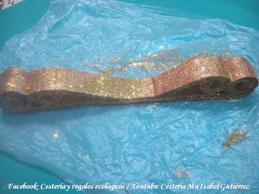 Ya seca la pintura clara, pintamos en color dorado (pintura acrílica) y antes de que seque, dejamos caer un poco de diamantina dorada...