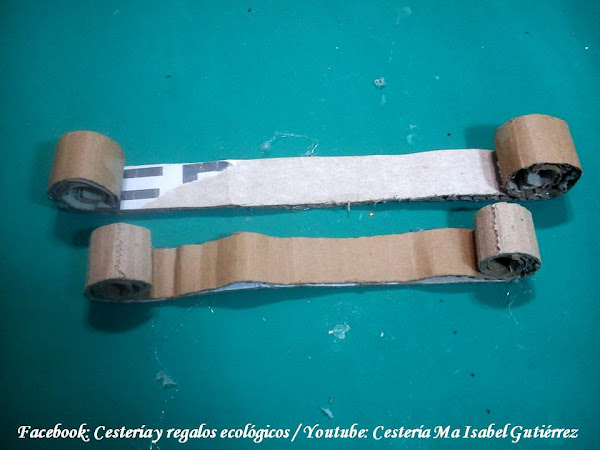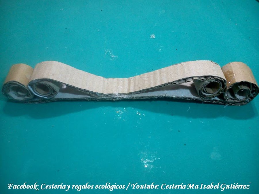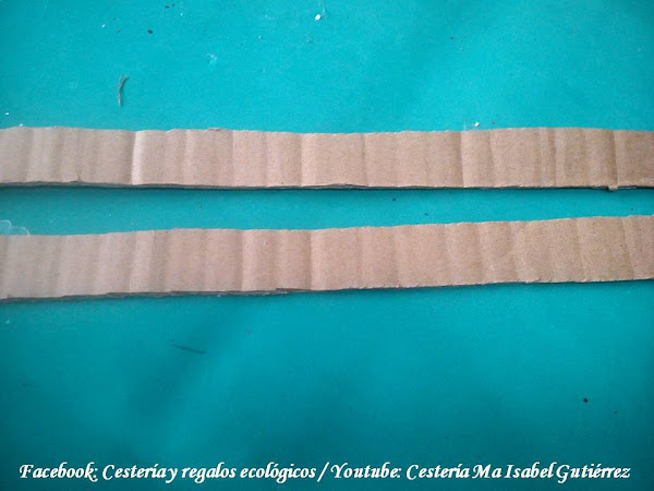 Parte inferior del trineo. Cortamos dos tiras largas de cartón, la primera tira debe medir el doble de lo que mide el largo del trineo, y la segunda tira de cartón, unos 15 cms., menos que la primera... suavizamos las tiras doblando un poco a todo lo largo... y si aún queda muy duro el cartón, cortamos el cartón por su parte media a todo lo largo, o sea, separamos esta tira en dos...