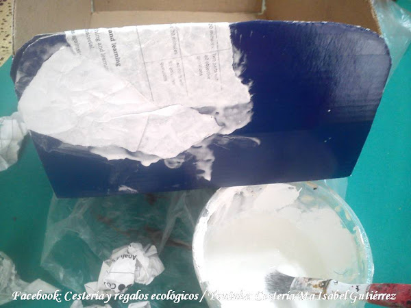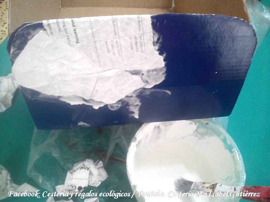 Desdoblamos los pedazos de papel y empezamos a pegar en toda la caja de cartón, aplicando primero el pegamento y luego el papel, damos pequeños golpecitos con la brocha para que se adhiera bien, procurando no deshacer lo arrugado... ya que esté toda la caja cubierta con la primera capa de papel, dejamos secar y luego aplicamos una segunda capa de papel...