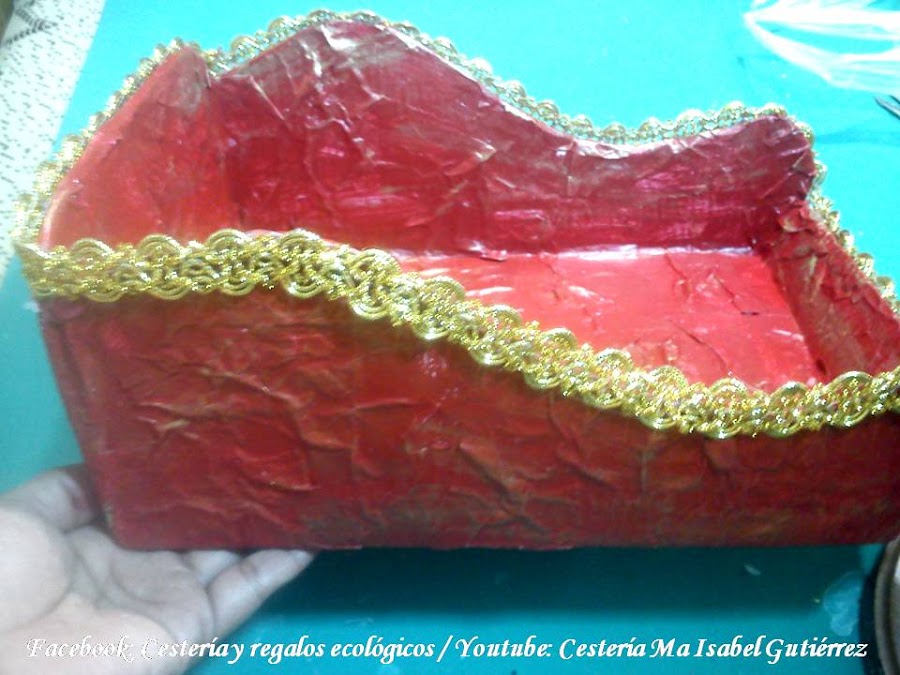 Ya que secó la pintura roja, con un pincel o brocha de cerdas suaves y secas, aplicamos pintura dorada, quitando el exceso antes de aplicar, se trata de realzar los relieves del papel arrugado...