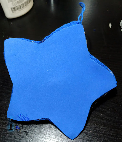 Luego, con silicona caliente y poco a poco, fui pegando la pieza de gomaeva a la parte posterior de la estrella, por detrás y pegando sólo los bordes en los que además el ganchillo está más cerrado.