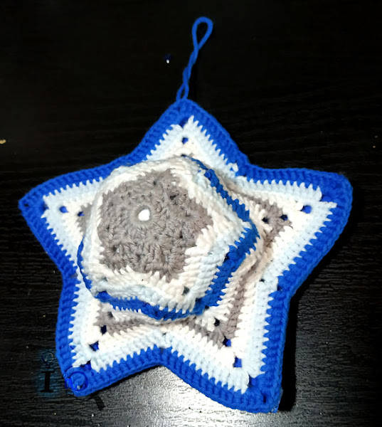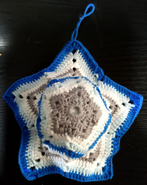La cosa surgió cuándo estaba haciendo la mantita de apego de elefante, me confundí al hacer la estrella y en vez de seguir el patrón tal cual le puse un punto menos en el hueco del medio, porque en realidad no entendía muy bien el patrón y supuse que sería simétrico.. (si veis el patrón que os he compartido lo entenderéis). Pues resulta que no, que la hacerlo simétrico quedaba como abombado hacia adentro y no había forma de ponerlo plano. Entonces ya investigué un poco más y acabé haciendo el patrón bien y ya quedaron las puntas planas... pero ya había hecho toda la parte central abombada. Y me negué a deshacerlo, porque como va con cachitos de lana cada vez que cambias de color tampoco me iba a servir de mucho....