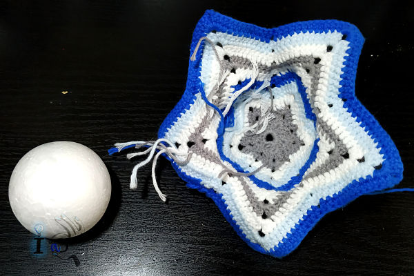 Busqué una bola de porex cuyo diámetro se ajustara a la parte interior de la zona abombada de la estrella. Rematé y corté los hilos, e incluso con el último hice un lazo para poder colgarla. Luego, con cola de carpintero rebajada con agua, pegué la bola de porex a la parte interior abombada de la estrella.