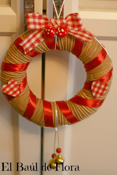 Una vez tengamos el aro completamente forrado del cartón ondulado enrollamos el lazo liso alrededor tal y como veis en la foto.