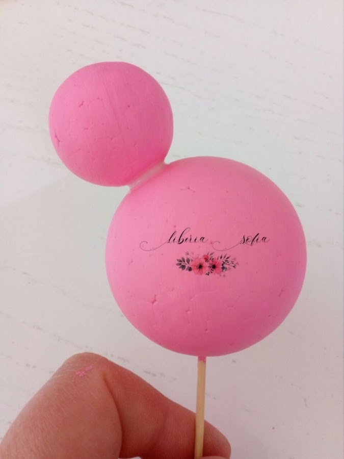 Cogemos la bola destinada para formar la cabeza y le clavamos un palillo o monda dientes justo por la linea que determina la mitad de la bola, haremos esto para que al pintar la bola podamos manejarla sin mancharnos las manos, también nos servirá de guía el agujerito que habremos formado para después formar un agujero más ancho para que pase el lápiz. Lo mismo haremos con las dos bolas destinadas para formar las orejas.