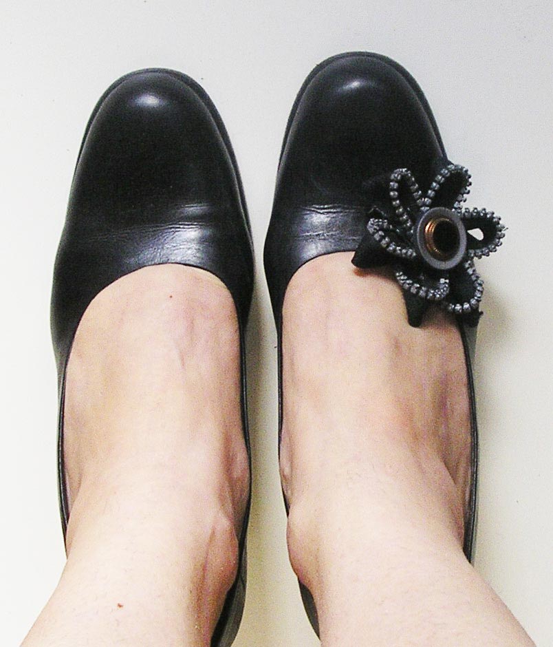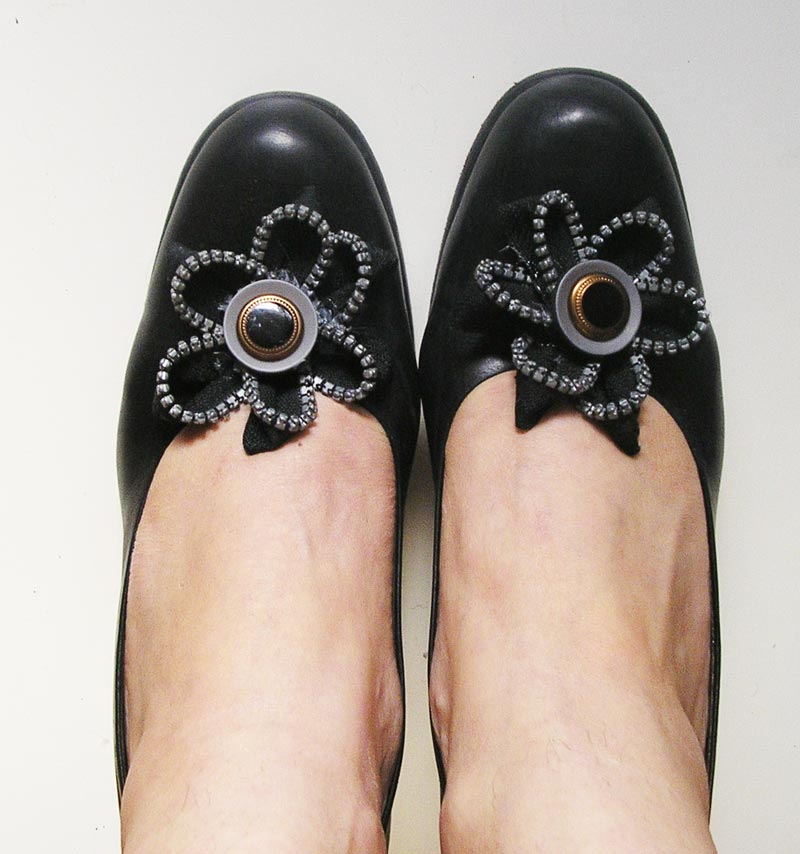 En la parte de atrás poner un clip con un redondel de fieltro entre el clip y el adorno del zapato.
