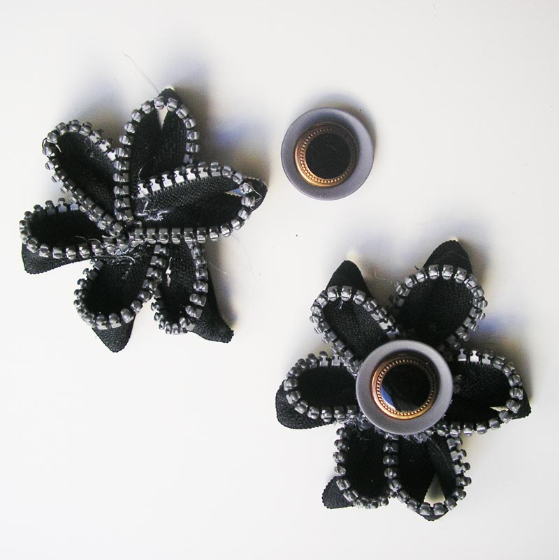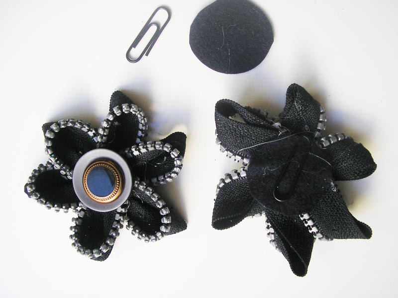 Unir en redondo las seis partes de la cremallera (pétalos), pegar en el centro los botones.