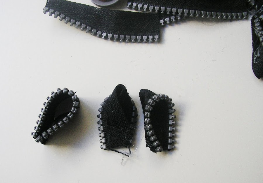 Cortar la cremallera en doce partes iguales. Con la pistola de silicona unir por la mitad los trozos de cremallera y el pliegue pegarle hacia un lado.