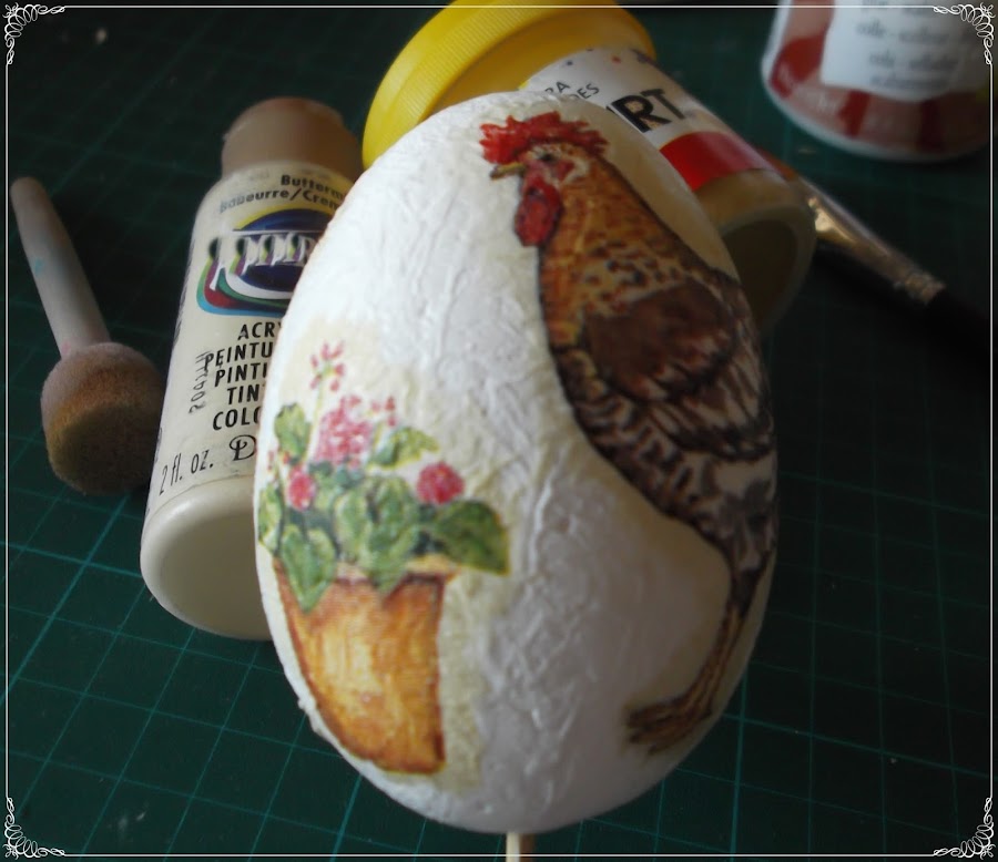 He utilizado arena de color albero en la base de los huevos, para hacerlos, digamos, mas campestres. De nuevo utilizo pátina para integrar las imágenes y hago un pequeño punteado con pintura acrílica en color negro.