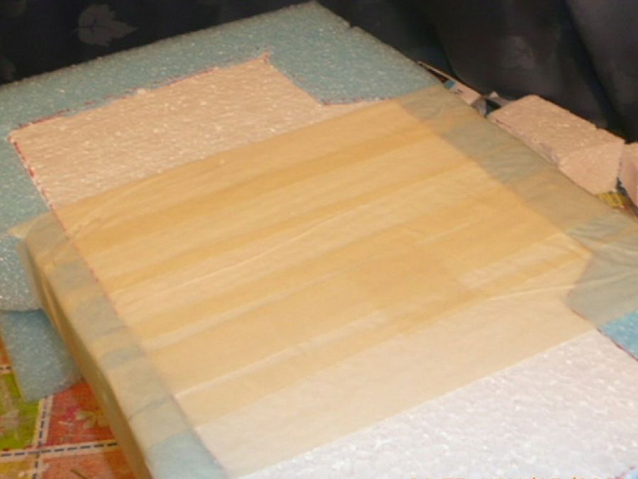 La pieza añadida se afirma en el soporte con varias vueltas de cinta de carrocero. El objeto del trabajo es hacer una bonita bandeja.