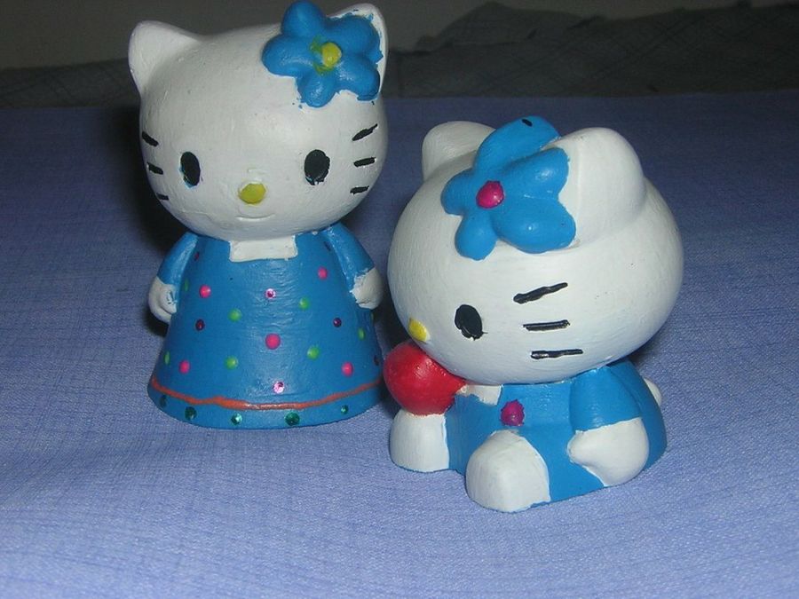Marieta_M es una de las foreras más apasionadas de Kitty. Un día encontró en una tienda unas figuras de escayola con la mágica gatita, y se puso loca de contenta. Compró todas las que pudo para pintarlas con su niña, y aquí vemos una muestra de aquella divertida sesión. La pequeña Lola pintó la de la izquierda, y con las enseñanzas de su mamá hizo un trabajo estupendo.