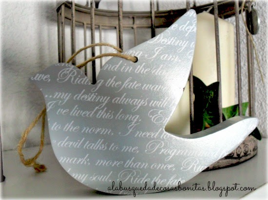 También se vino conmigo este pájaro de madera gris con letras blancas:
