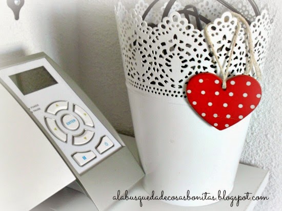 Y es que los adornos de madera pintada creo que personalizan los rincones o los objetos donde los colocamos, aunque sean pequeños como este corazón con topos blancos: