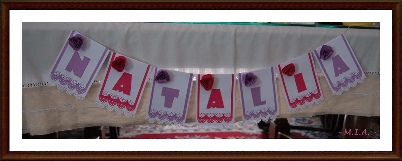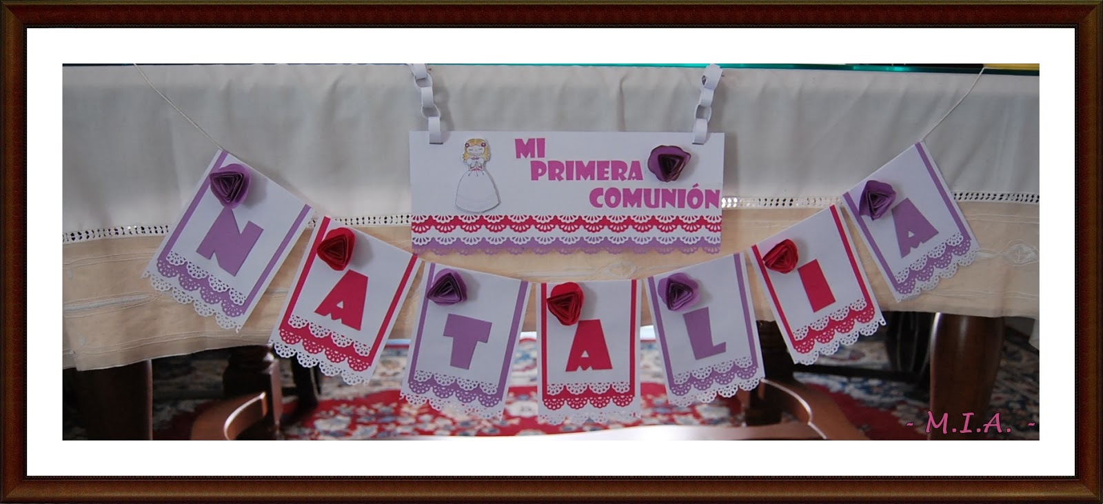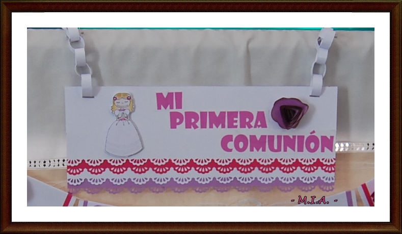 Combinación de cartulinas blanca, rosa y lila, los colores preferidos de la niña, a gusto de ella... y todo preparado para su gran día.