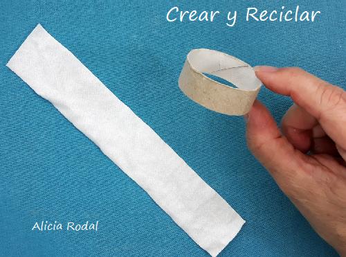 Con esta tira de tela, vamos a forrar el rollo de cartón desde afuera hacia adentro, por ambos lados.