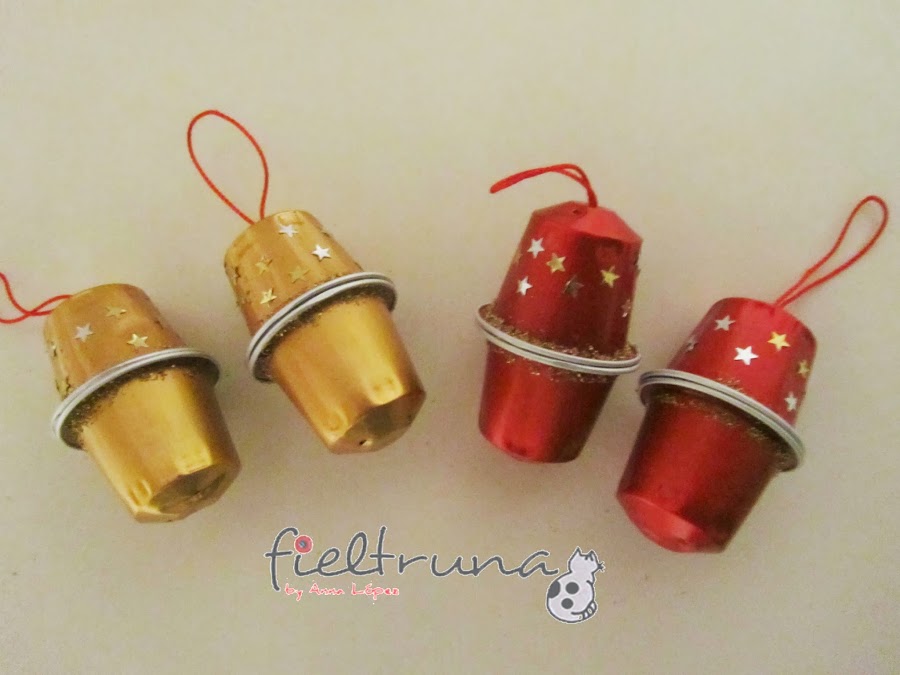 - Cápsulas Nespresso (rojas y doradas son las que he elegido yo, pero tú a tu gusto, si tu árbol es blanco creo que quedarían muy bien las verdes, y las negras le darían un toque muy sofisticado, no?, pero si es verde busca tonos que resalten)