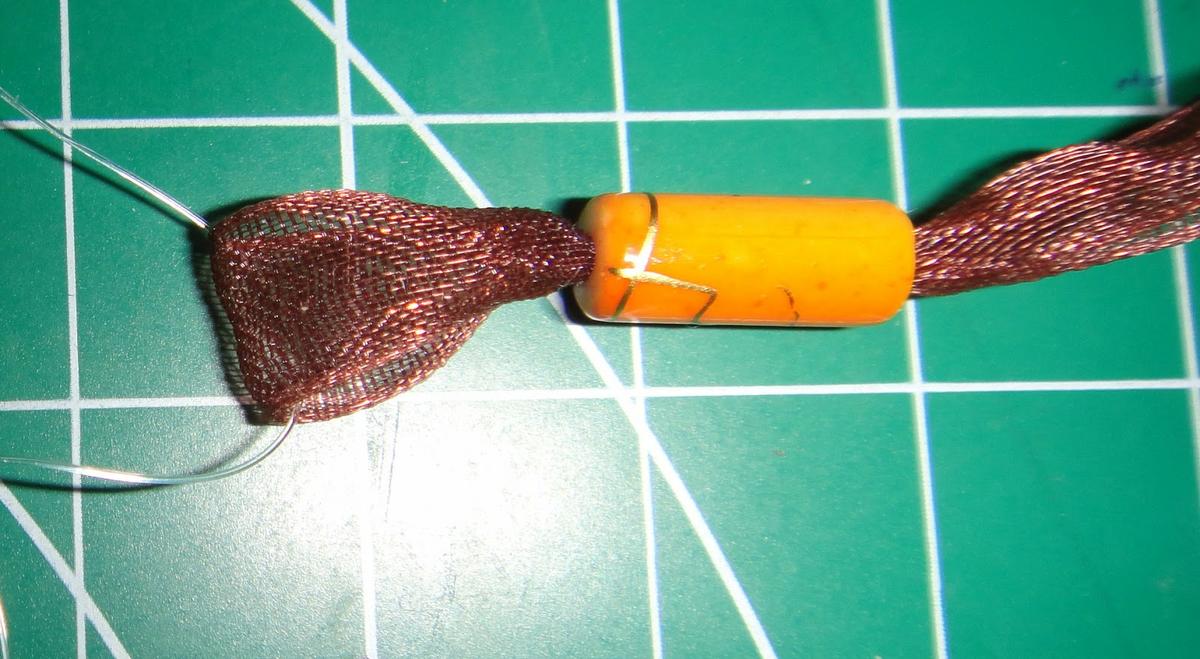Pasáis uno o dos abalorios, ayudándoos con el hilo de nailon. Se engancha el hilo de nailon al extremo doblado de la cinta, y se pasa por el abalorio, tirando cuando lleguemos a la cinta para que esta pueda pasar también.