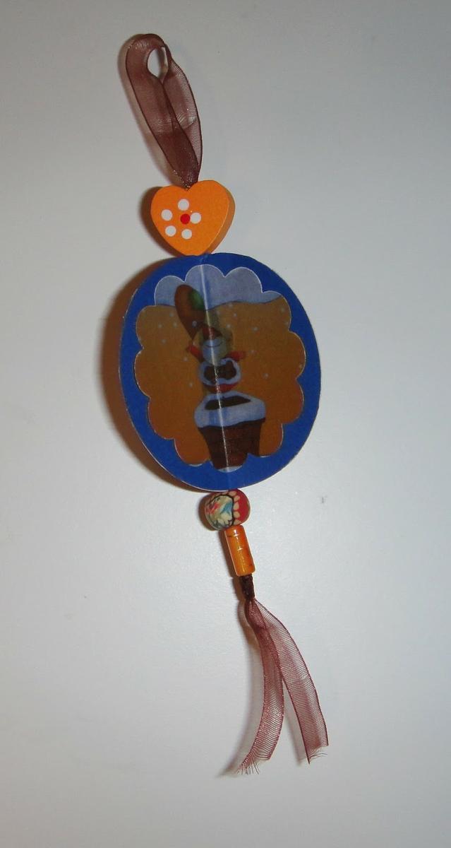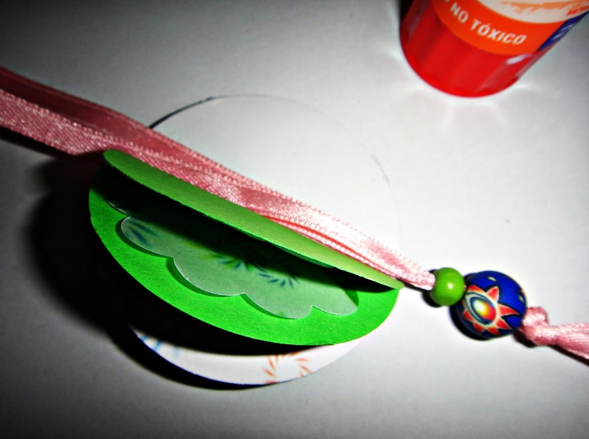 Cuando hayamos pasado uno o dos abalorios, hay que cerrar el adorno de cartulina, con la cinta en su interior. Colocamos la cinta lo más centrada posible y pegamos bien la cartulina.