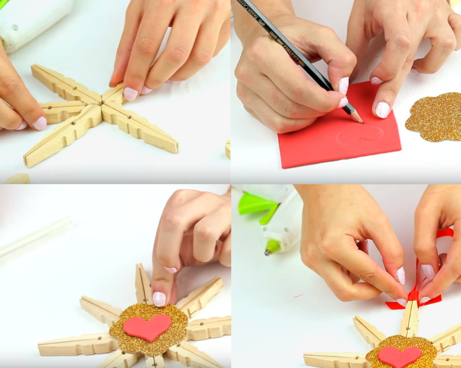 - Desmontamos las pinzas de madera y las pegamos de 2 en 2 entre ellas con la silicona.