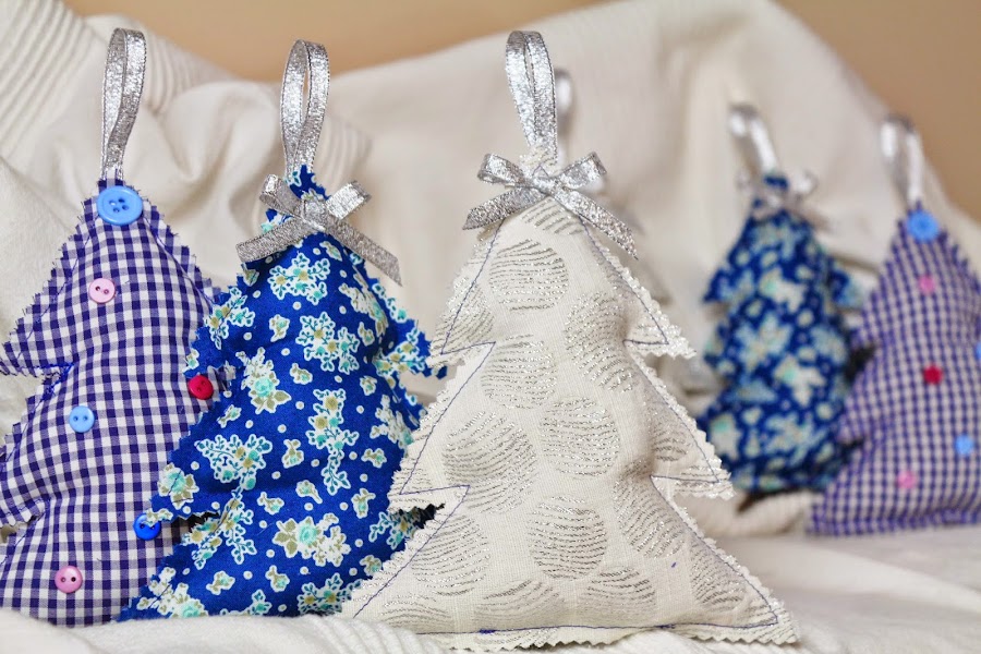 He combinado varias telas en tonos azules y una en blanco roto y plateado que le da un aire más festivo y hace juego con el lazo que he usado para colgarla. Más abajo tienes el tutorial.
