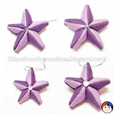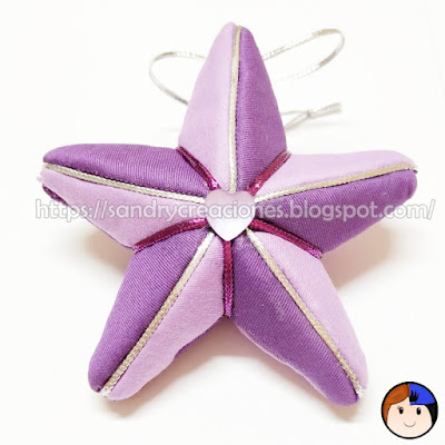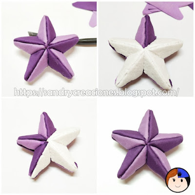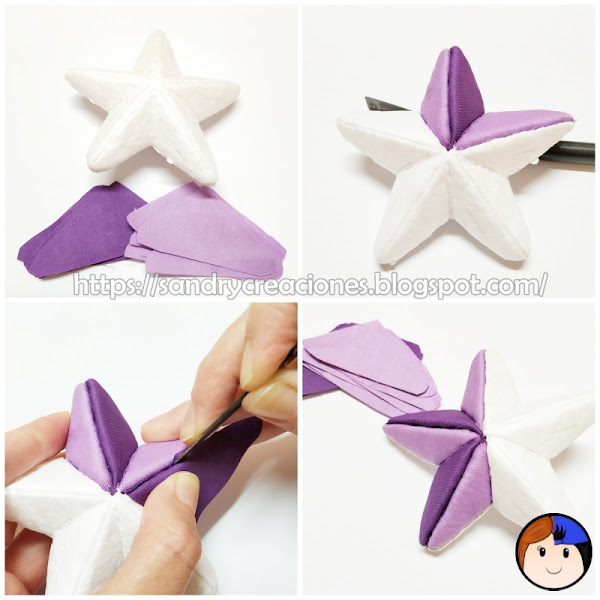 Paso 2. Cubrir las secciones con tela. Una vez tenemos hechos los cortes, recortaremos pequeños trozos de tela un poco más grandes que la porciones a cubrir y empezaremos a forrar la estrella. Para hacer nuestra estrella hemos jugado con dos tonos de tela lisa de color lila, intercalándolos. Para cubrir las porciones de la estrella, al igual que la bola, iremos arremetiendo los lados de la tela de cada porción dentro del corte que hemos hecho en el porexpan con la ayuda de una espátula u otro objeto delgado que nos ayude.